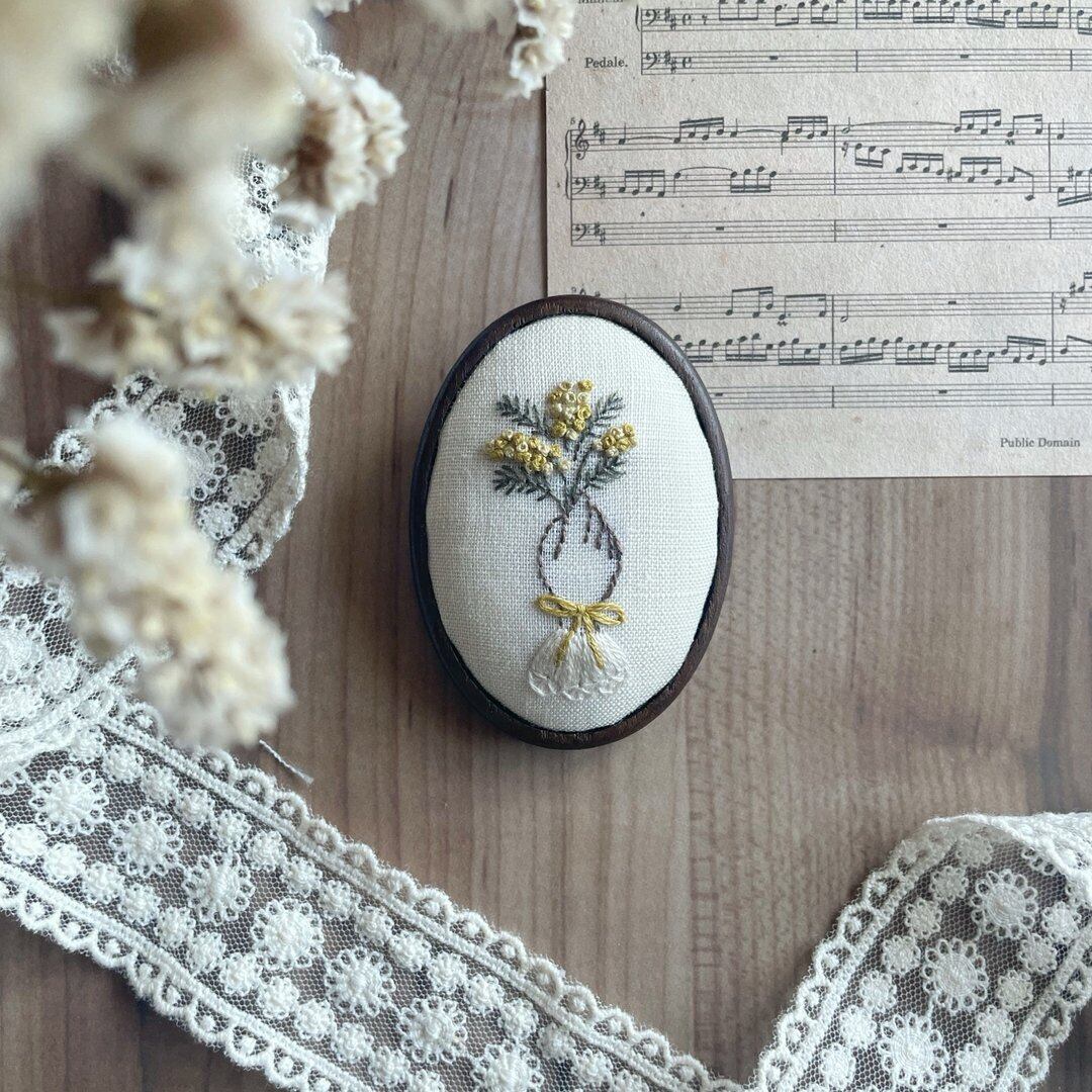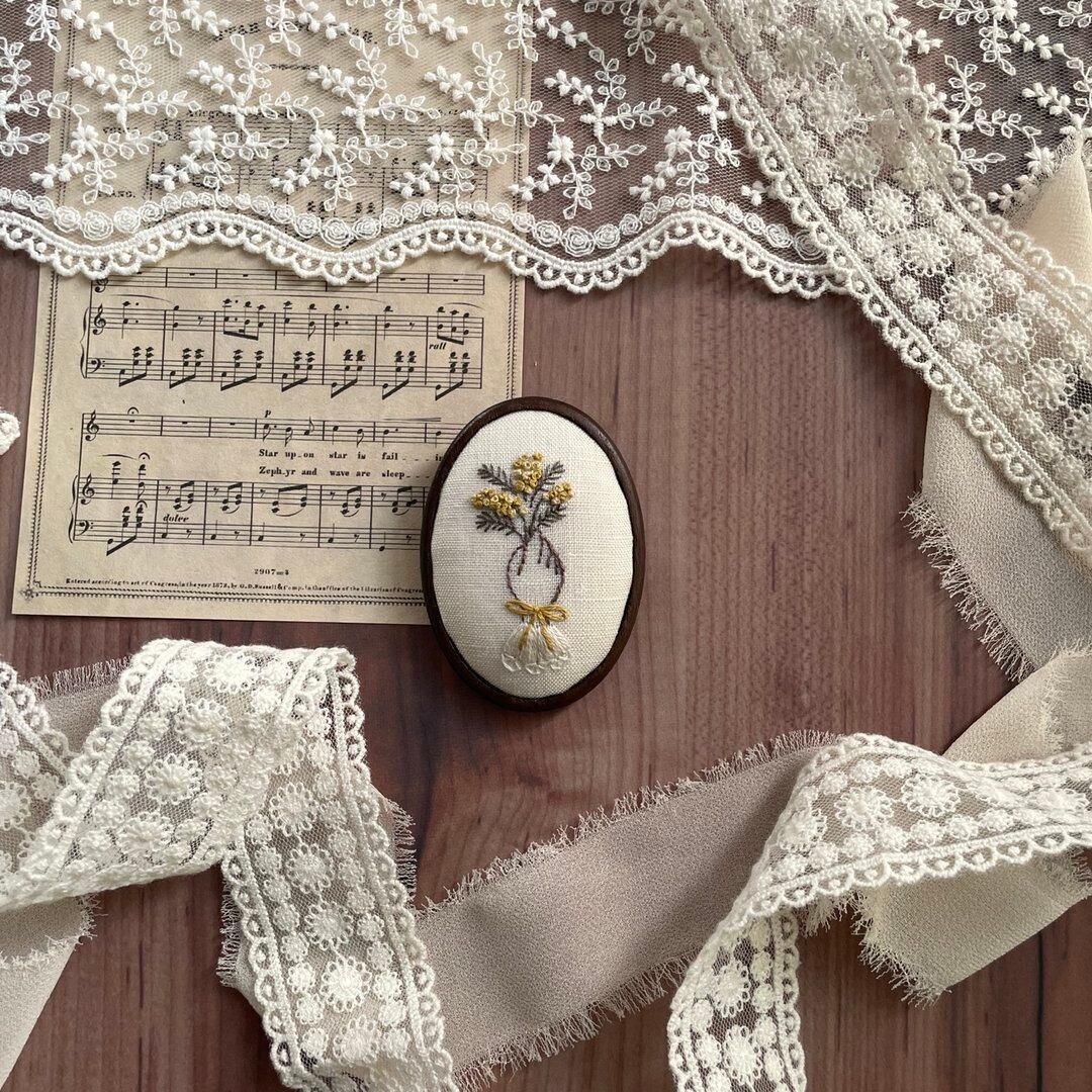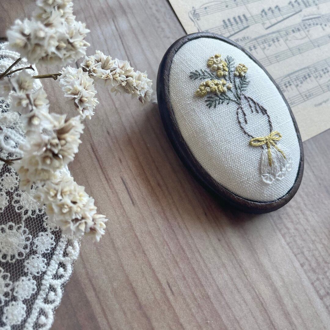 優しい雰囲気の木枠と手刺繍のブローチです。